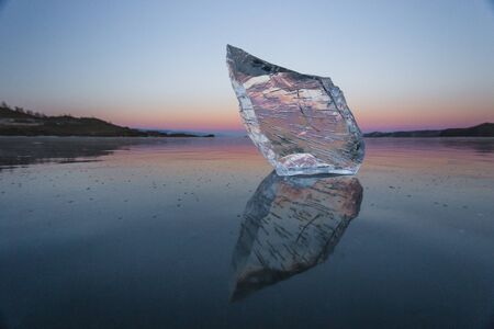 A piece of clear ice on Lake Baikal at sunset