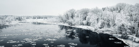 Panoramic aerial view of the frozen snow-covered forest river. Hoarfrost on trees. Reflections in the dark water. Winter wonderland. Christmas, seasons, nature, environment, climate change