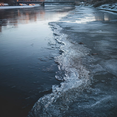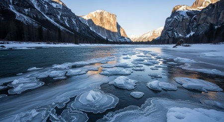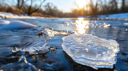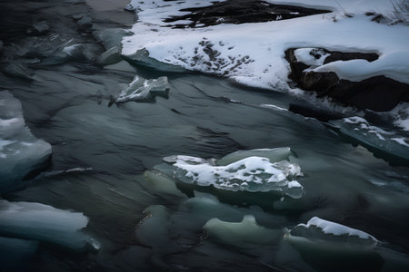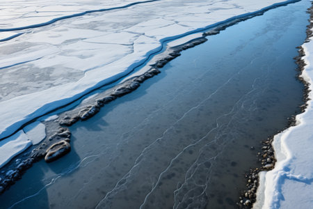 Close-up view of ice floes on a frozen lake during winter. The image captures the beauty and serenity of a winter wonderland.