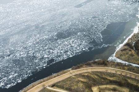 ice drift, ice floes float on the river in early spring, the river is opened from ice, snow melts