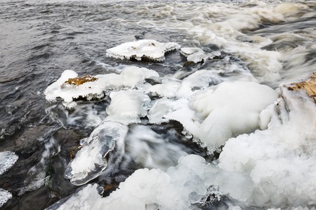 Ice on frozen river, closeup detail, water flows over rocks - winter background
