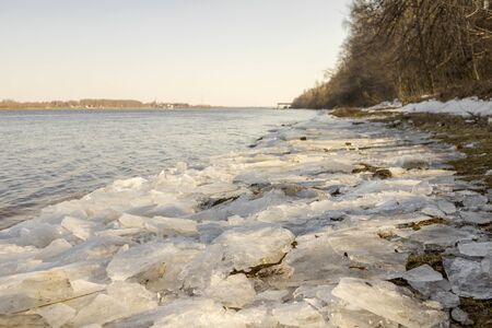 Spring melting of ice and snow on the river on a sunny day