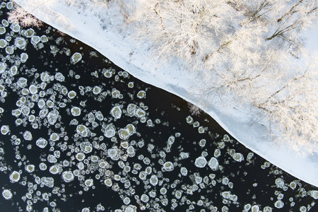 Aerial top down view of narrow river flowing between snow covered trees. Chilly winter day. Scenic winter landscape near Vilnius, Lithuania.
