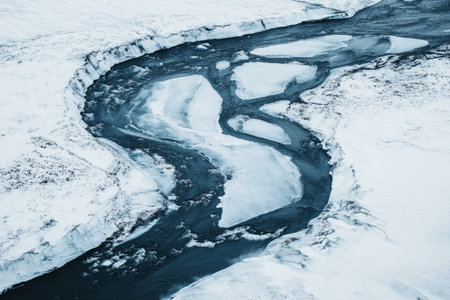 Blue winter river flows between ice floes. Arctic landscape on sunny day. Water boils and forms ripples on the sea.