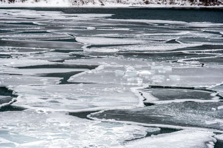 The ice floe on the river in winter under snow in the water