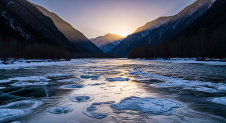 Stunning winter lake scene with icy surface and snowy mountains. Peaceful atmosphere.
