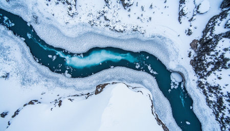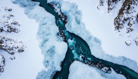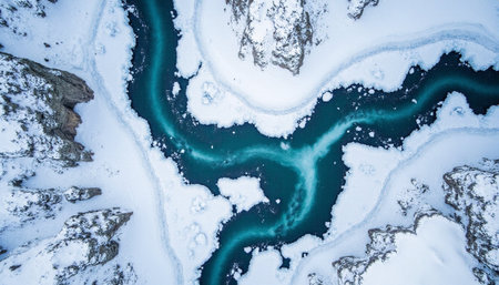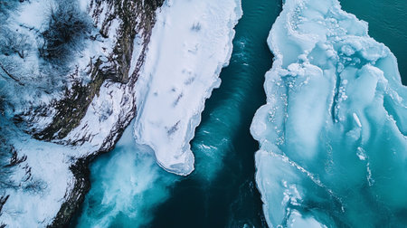 overhead top view of frozen river beach copy space