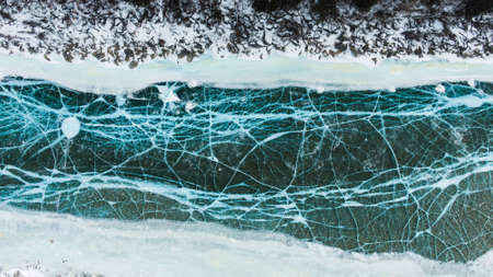 Aerial view of frozen lake. Cracked Ice from drone view. Background texture concept