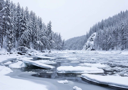 Beautiful winter landscape with a frozen mountain river and coniferous forest