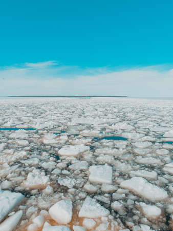 ice drift, ice floes float on the river in early spring, the river is opened from ice, snow melts