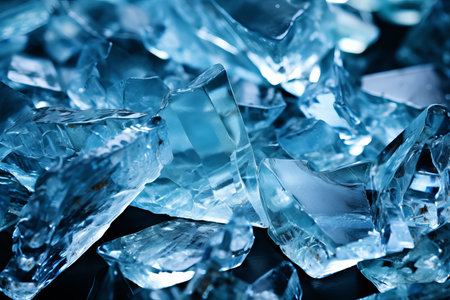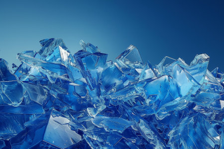 Shards of clear blue ice are scattered, catching the light and creating a bright and vibrant look. The scene evokes a sense of cold beauty and winter charm.