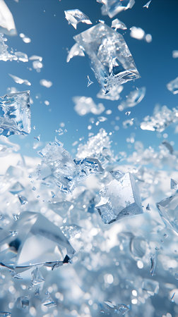 Shards of translucent ice crystals float against darkness; some covered with frost, highlighting irregular shapes and textures. Small ice particles add dynamism and sparkle