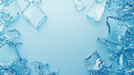 Irregular cracked ice fragments on a pale blue background, evoking coldness. Copy space