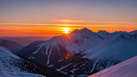 Breathtaking winter sunrise over snowy mountain valley with pine trees.