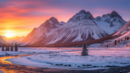 A peaceful winter scene featuring a frozen river flowing through a snowy valley surrounded by snow-capped mountains and evergreen trees under a vibrant sunset sky with a snowy atmosphere.