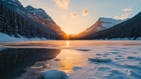 Low sun illuminating frozen lake surface between snow covered mountains and pine forests at sunrise, creating a beautiful reflection of golden light on ice