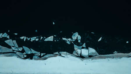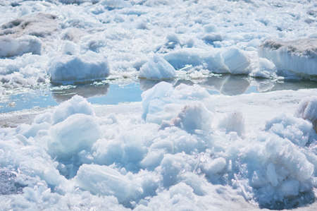 Shards of ice near the water. Pieces of crushed ice. Ice texture.