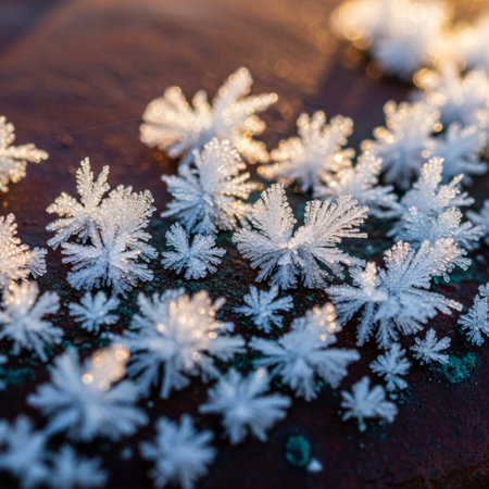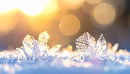 Macro view of intricate ice crystals sparkling on a surface with soft sunlight and bokeh
