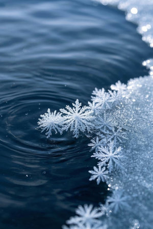 Delicate ice crystals shimmer in a serene winter scene, creating an abstract frost effect of beauty and tranquility.