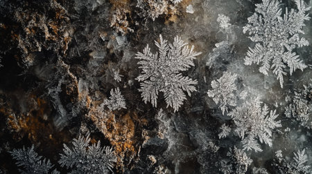 Ice crystals in the shape of snowflakes, forming a beautiful and intricate pattern against a cold, frosty background. The delicate snowflakes create a stunning winter scene, showcasing the artistry of nature's frozen beauty.