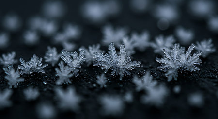 Macro close-up of intricate natural ice crystal snowflakes with detailed patterns on a dark surface