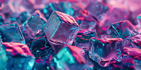 A vibrant and detailed closeup image showcasing ice cubes, augmented with playful and dynamic lighting effects
