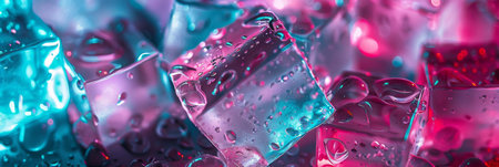 Vivid ice cubes, glimmering with glistening water droplets, are beautifully illuminated in striking pink and blue tones