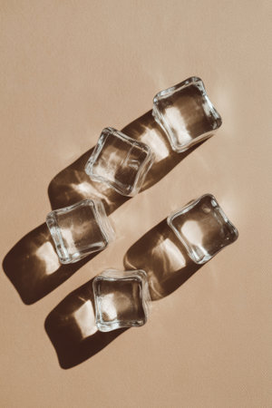 Four clear ice cubes lay on a warm beige backdrop, creating gentle shadows as the afternoon light highlights their transparency and shape.