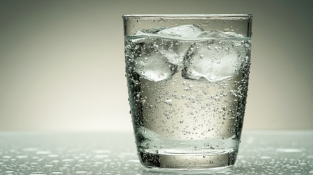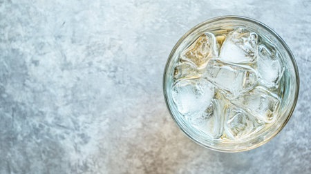A refreshing glass of water filled with ice cubes sits elegantly on a soft color backdrop. This image captures a moment of coolness perfect for drinks or summer concepts.