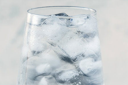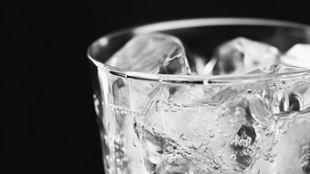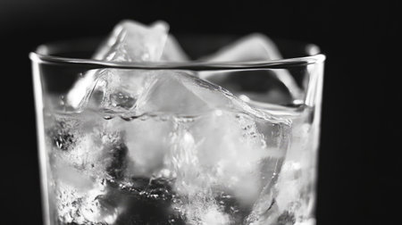 A close-up view of a glass filled with ice water, showcasing droplets and condensation. This image captures refreshing hydration and the allure of a cool drink. Perfect for summer or beverage-related themes.