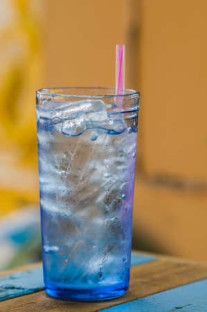 Close up of pure water with ice and paper straw in transparent glass and sun glare on blue background.