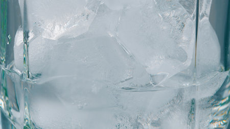 A close-up of sparkling ice cubes in a glass, with light refracting through the clear, frozen pieces and condensation forming on the surface.