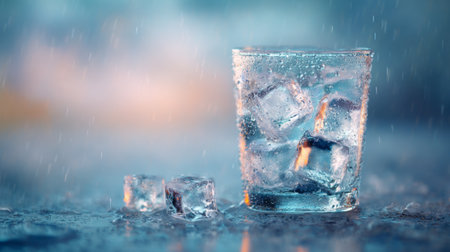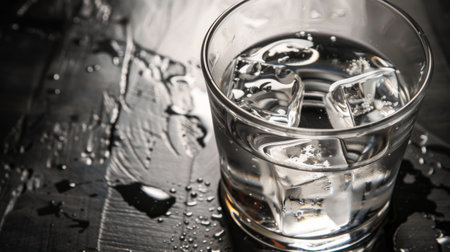 A refreshing glass filled with ice cubes sits on a wet surface, showcasing droplets that enhance the cool and inviting atmosphere. Ideal for hydration themes.