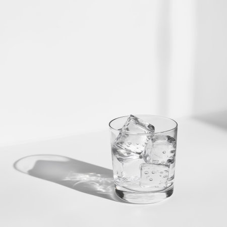 Close-Up of Transparent Glass with Ice Cubes on Flat Surface on the white background