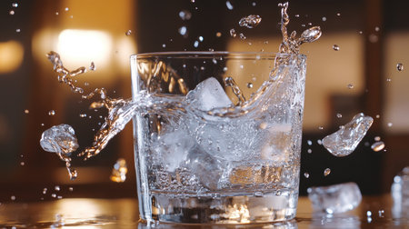 A mesmerizing splash of water erupts from a glass filled with ice cubes, capturing the essence of refreshment. Perfect for beverage themes.