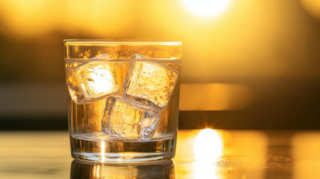 A refreshing glass of clear water filled with ice cubes, beautifully illuminated by the warm glow of a sunset, creating a serene atmosphere perfect for relaxation.