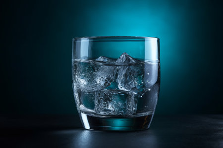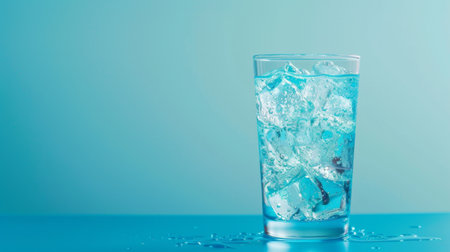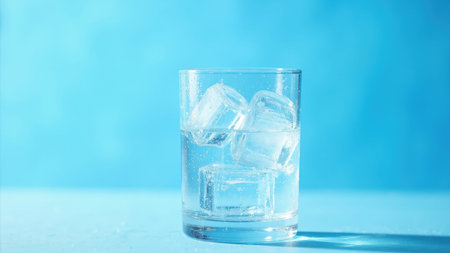 Glass of water with ice cubes in a blue-tinted environment. The cold and clear ice against the blue backdrop highlights themes of refreshment and purity, ideal for beverage and health-related visuals.