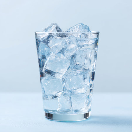 This image features a clear glass filled with ice cubes and water, set against a light blue background. It conveys refreshing hydration and summer vibes.