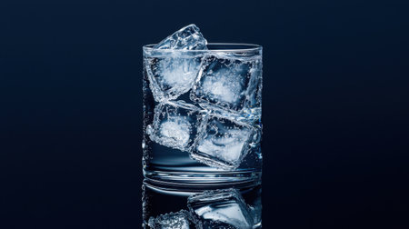 A captivating image of a clear glass filled with ice cubes and sparkling water, beautifully reflecting on a dark surface, perfect for enticing beverage themes.