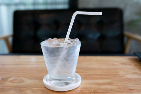 Glass of cool water and cool coffee on wooden table in coffee shop background.
