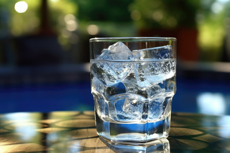 Glass of ice cubes on a reflective surface with blurred greenery background, refreshing and cool concept