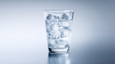 A tall glass filled with ice cubes and water is placed against a light-blue gradient background. The glass is transparent, showcasing the clear water and the shapes of the ice. The composition employs overhead lighting and a clean, minimalist style. This image is suitable for a variety of commercial and editorial purposes.