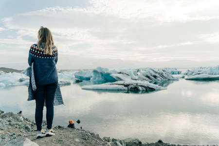 Woman explorer lookig at Jokulsarlon lagoon, Iceland.