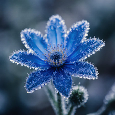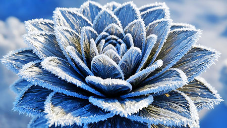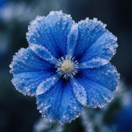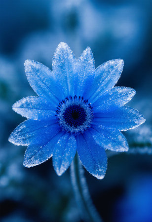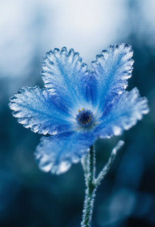 AI Generated. Closeup of Frosted Blue Petals with Ice Crystals on Blurred Soft Background for Nature Concept