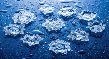 Close up of intricate ice crystals melting on a dark blue surface covered with water droplets and small puddles. Abstract cold background.