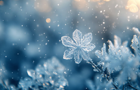Intricate ice flowers lay gracefully on a soft blue backdrop, surrounded by shimmering snowflakes. The winter chill breathes life into this enchanting, icy landscape.