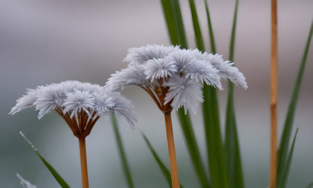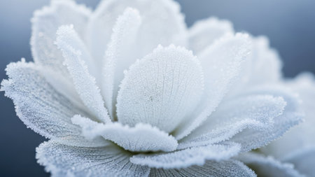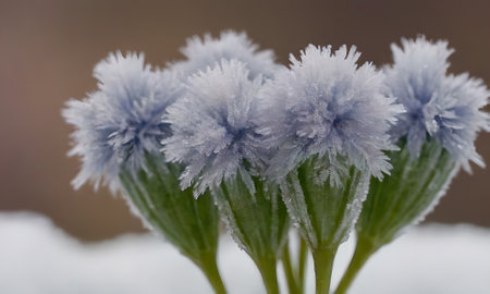 Close-up captures delicate frosted flowers in a cold environment. The composition features subtle textures and soft, diffused lighting. The image evokes a sense of tranquility and is suitable for various commercial purposes, including editorial content and design projects.