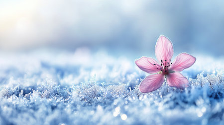A stunning single pink flower emerges from a frost-covered meadow, capturing the essence of winter's delicate beauty. Soft light enhances the serene atmosphere, perfect for nature lovers.