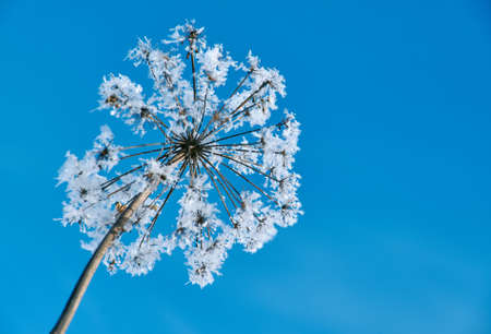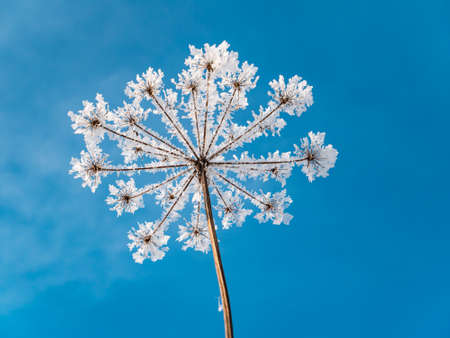 Crystal snow-flowers against the blue sky. Winter wonder of nature crystals of frost.Winter scene landscape