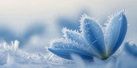 Frozen ice crystals form intricate, delicate patterns in winter minimalism, highlighting a soft blue-white gradient against a blurred background.